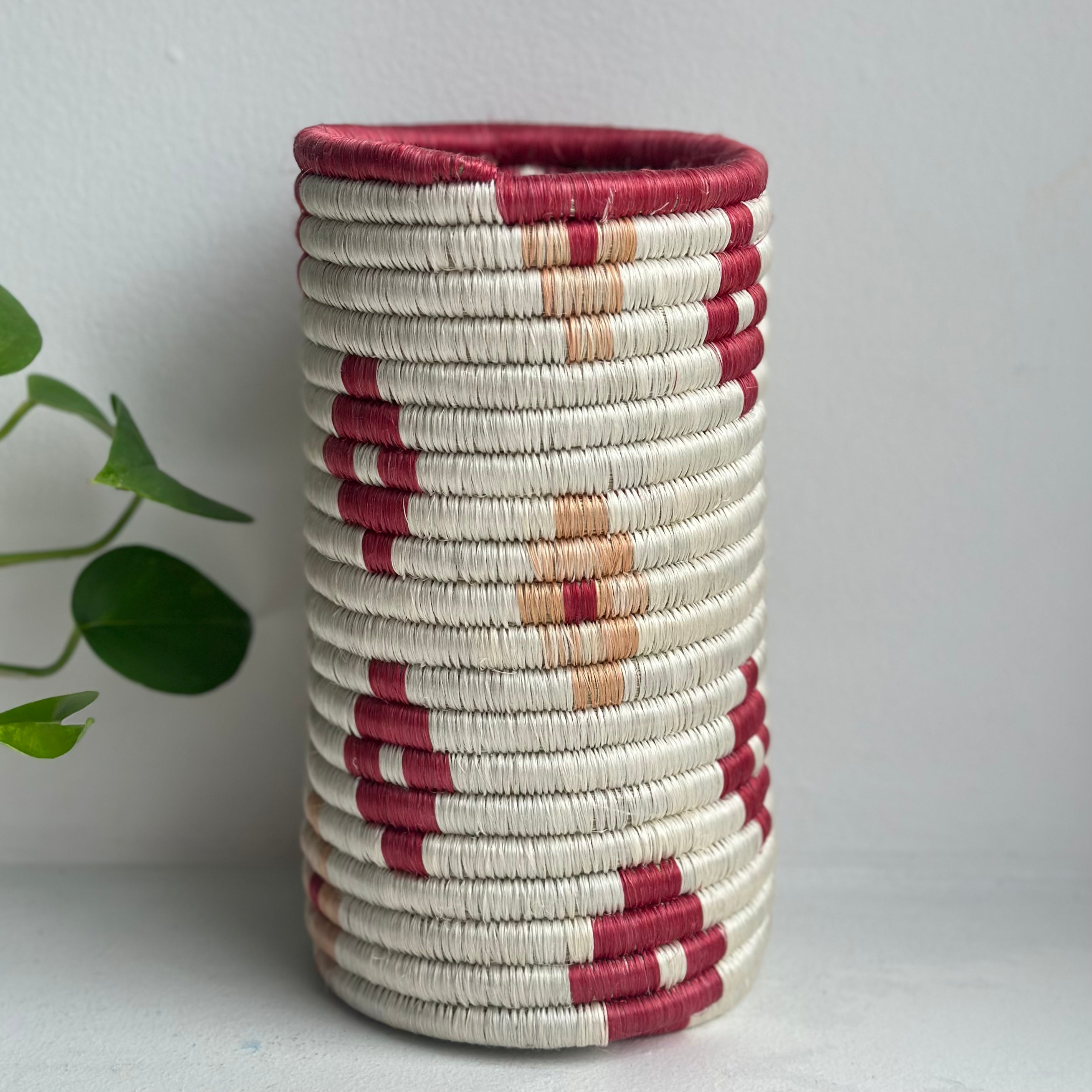 Beautiful woven vases made from sisal and grass! Adds a functional pop of color in your kitchen, or hang on your wall as an accent piece for any room!